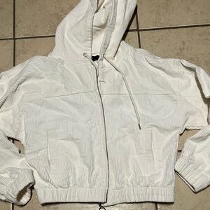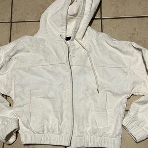 Chic cream jacket with ribbed texture. Features a hood and zip front.