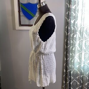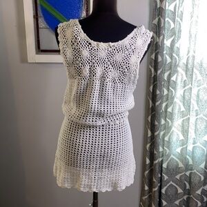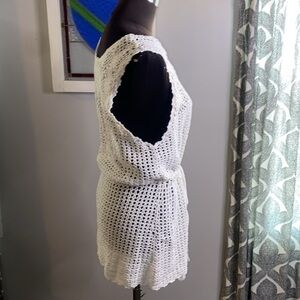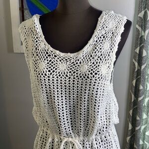 Beautiful crochet knit sleeveless top with delicate open weave pattern. Features a scoop neckline and drawstring waist detail. Feminine and airy design perfect for layering. Size 1X. Measures 19” across the chest & 28” long. In excellent pre loved condition.