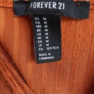 Spaghetti strap cropped tank top by Forever 21. Material is a sort of shimmery orange/amber color. Very flattering and soft.