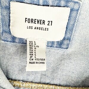 Keywords: denim jacket, cropped jacket, forever 21, light wash, distressed denim, casual jacket, women's jacket, jean jacket, size L, raw hem, button up, chest pockets, long sleeve