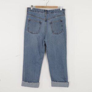 Forever 21 Cuffed Jeans size 30. Pre owned in great condition. There are two holes on the inside rear waist area where I had put elastic through so they would fit my daughter. Elastic has been taken out. Holes are only on inside. See photos.