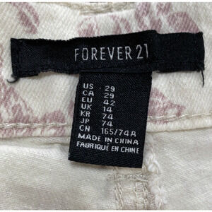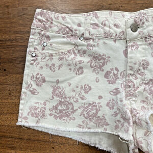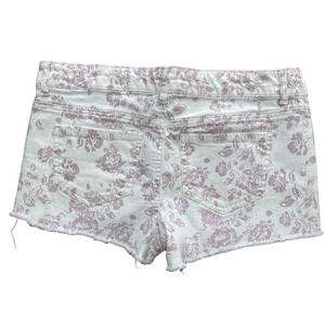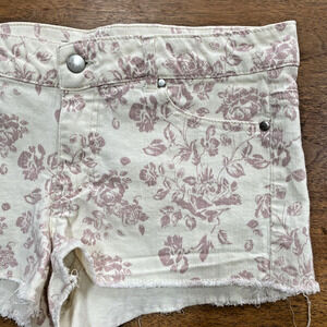 Forever 21 Cut Off Shorts - super cute creamy white & dusty rose floral print on cotton stretch denim canvas fabric - fantastic Boho Festival vibes - ladies size 29. Flat front - 5-pocket style - belt loops - zipper & button closure. Gently worn - no flaws.