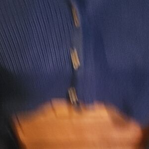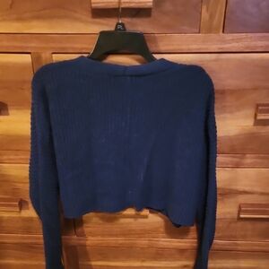 Chic deep blue cardigan with button front. Soft knit texture. Ideal for layering.