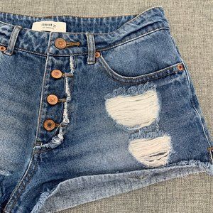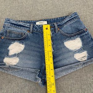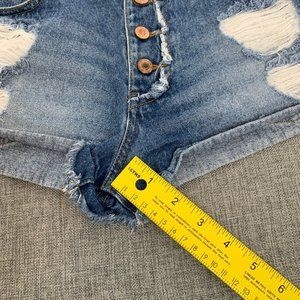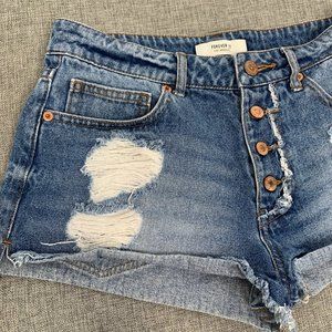 Forever 21 Denim Booty Shorts 4 Buttons Mid Rise Distressed Size 26 Cotton Jeans