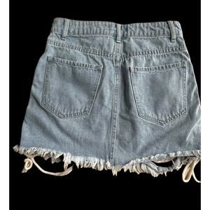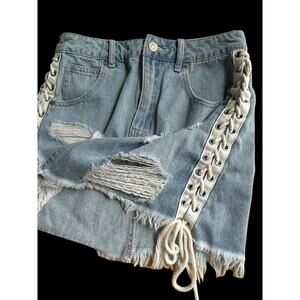 mini skirt in medium wash ,, heavily distressed with Side lace and frayed Hem.