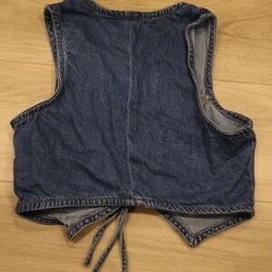 cropped denim vest, used in great condition, ties in the front top and bottom. denim vest for sale only, shirt not included just for reference on how cute it is!