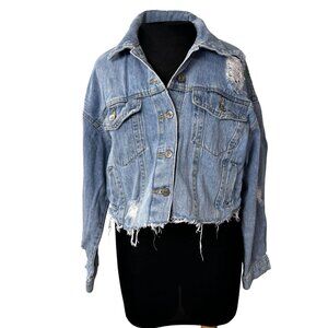 Forever 21 Distressed Cropped Denim Jacket Medium Light Wash Frayed Hem Womens