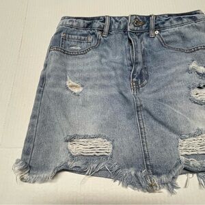 Chic mini skirt with distressed details. Frayed hem adds edge. Ideal for casual wear.