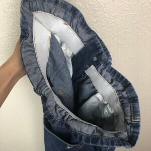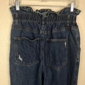 Forever 21 paper bag high rise denim jeans. Size 26 waist. Blue dark wash. Factory distressed torn holes. The pockets in front are big pockets, like those in mens jeans. Wish all womens jeans had pockets like this! Cropped rolled hem leg. They're made to stay in that style, the hem cannot be unrolled.