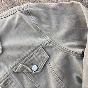 Elevate your style with this distressed tan denim jacket. Perfect for casual outings, it features unique zipper details and a rugged look. One of the sleeve zippers doesn’t work . Wear this with a black undershirt for styling purposes