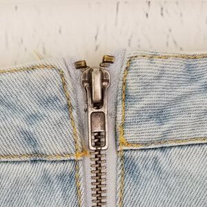 Cute distressed denim mini skirt. Approximate measurements are waist 17". Length 14". Zipper all the way down front.