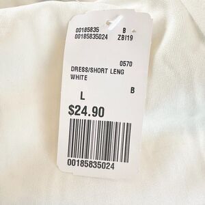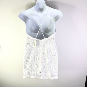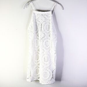 Beautiful halter mini dress in white crochet open work lace overlay that is fully lined. Backless style, sweet and sexy. Brand new with tags. Size Large.