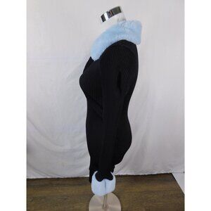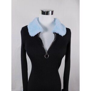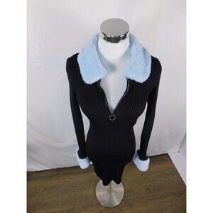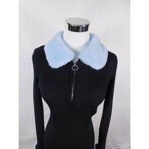 Forever 21 Dress Womens Medium Black Sky Blue Ribbed Bodycon Faux Fur Collar Zip