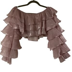 Stunning Forever 21 off-shoulder chiffon crop top in a dreamy dusty rose pink hue. Features tiered tulle-like ruffles across the bodice and sleeves for a statement romantic look. Perfect for concerts, date nights, or watching the Super Bowl halftime show when Bad Bunny performs π