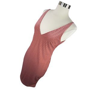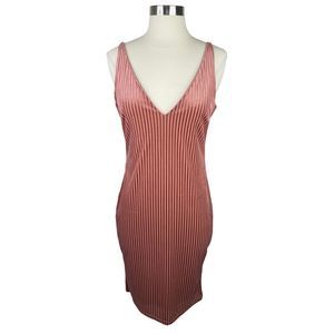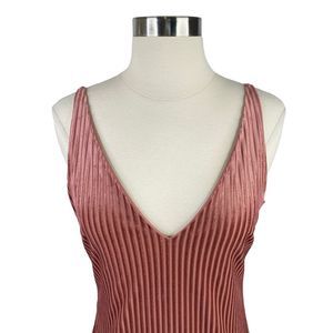 Dusty rose/mauve sleeveless midi dress, v-neckline/deep v-back, velvet velour & mesh ribbed texture, pull over style, slight stretch, cami straps, bodycon silhouette