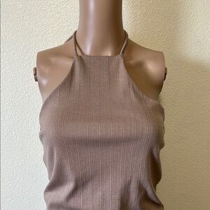 This elegant tan sleeveless dress is perfect for any occasion. Its sleek design offers a flattering fit, making it a versatile addition to your wardrobe.