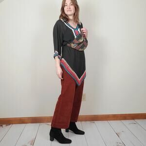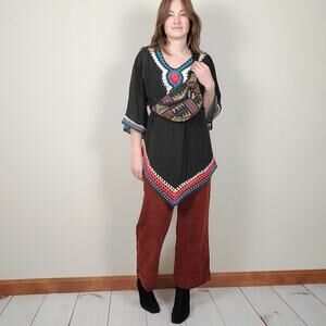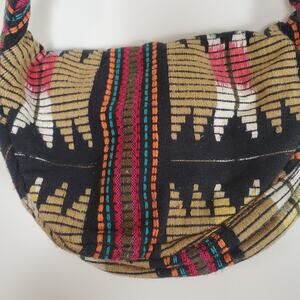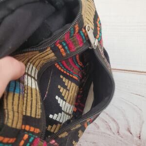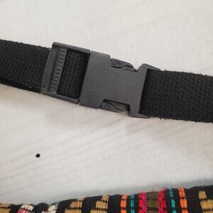 Black canvas fanny pack or belt bag with multicolor southwestern geometric or tribal style woven embroidery. Colors include light camel brown, white, mocha brown, hot pink, teal, orange, red, pine green, and yellow. Main and small front compartment, both zippered. Adjustable belt strap. Baja bustier dress and crochet poncho tunic pictured are both also for sale - see separate listings for the full festy looks!
