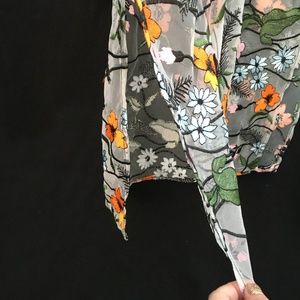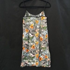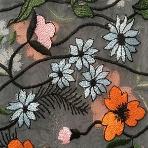 Vibrant orange, pale pink, and light blue flowers adorn a very sheer mesh cami dress accented with black vines + black trim long the neckline. Adjustable black straps, slits on both sides. No stretch. Runs a little large through the bodice. Undergarments not included. Could work as a beach coverup. Never worn and in great condition.