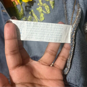 Cute and unique jean jacket with embroidery detailing on the back. Jacket has some stretch to it. Some of the embroidery is loose, I tried to capture this in the pictures.
