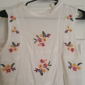 Delicate high-neck sleeveless blouse with beautiful floral embroidery and lace. Slightly cropped length perfect with high-waisted skirts and bottoms.