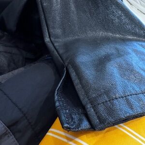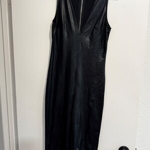 Sleek black faux leather jumpsuit with an ultra-soft, buttery feel. Features a deep V-neckline, sleeveless cut, and a cropped/ankle-length silhouette for a modern, edgy look. Back zipper closure for easy wear. Lightweight and comfortable despite the leather-look finish.