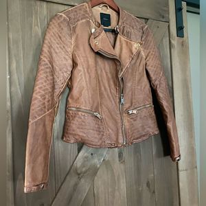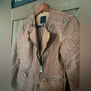 Faux Leather... VERY SOFT There is minimal signs of wear, discoloration on one of the zippers but overall great condition! See photos. Size small