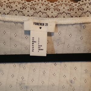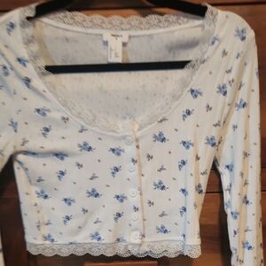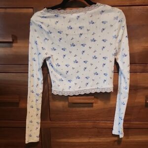 This chic Forever 21 blouse showcases a fitted, cropped silhouette with long sleeves, highlighted by a subtle blue floral pattern on a white base. The scoop neckline and stretchy ribbed fabric offer a comfortable and flattering fit, perfect for any occasion.