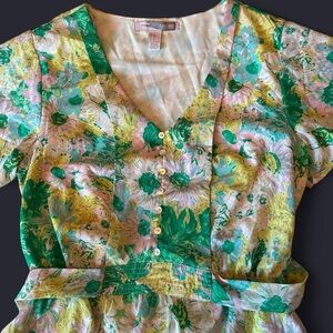 Say hello to your new favorite dress! This Forever 21 floral stunner is new without tags and fully lined for comfort. Featuring a flattering v-neck, button-front detail, and adjustable waist tie, it’s giving effortless vintage garden party vibes. The soft pastel palette of greens, pinks, and yellows makes it perfect for spring and summer days.