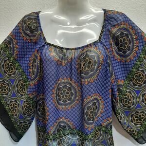 Forever 21 Floral Design Sheer Scarf Top, Rectangular Neckline, Batwing Sleeves, Black border Design around Waist and Sleeve Cuffs