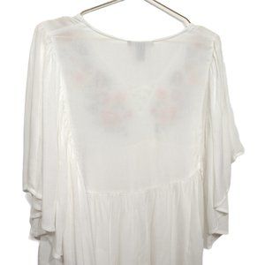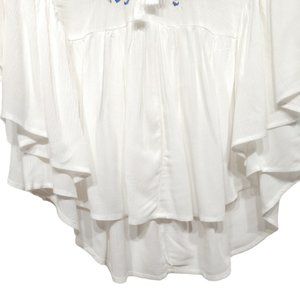This peasant top from Forever 21 in white, has floral embroidery, v-neck, lace-up tassel tie, angel sleeves, flounce hem and pullover for styling.
