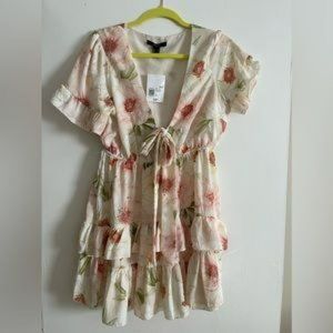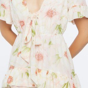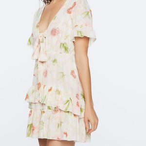 A woven mini dress featuring an allover floral pattern, plunging neckline, self-tie accent, flounce layers, short sleeves, smocked waist, and a flowy silhouette.