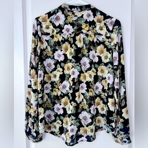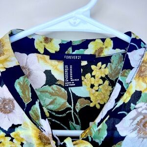 Women’s size Medium Forever 21 features a charming tie front and a classic peter pan collar. The vibrant yellow and white floral design stands out beautifully against the dark background, creating a striking contrast. With its long sleeves and flowy fabric, this top is perfect for adding a touch of sophistication to any outfit.