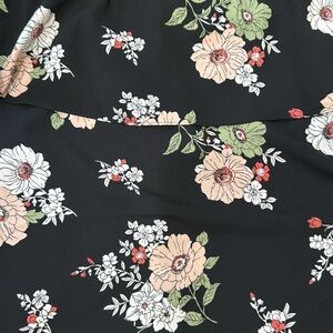 Chic off-shoulder dress with floral print. Features a black base with pink, white, and green flowers.