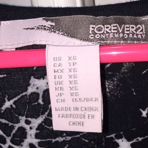 super trendy black and silver graphic tee from forever 21 it flows beautifully and has a super cool marble type drain on the back, the cut of this top is also very flattering! Size XS but will fit up to a medium :)