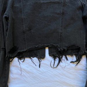 Clothing Details & Features: A denim jacket featuring light distressing, a dramatically frayed hem, basic collar, button-down front, chest flap pockets, front slanted pockets, and long puff sleeves. Hardly worn, practically brand new.