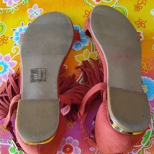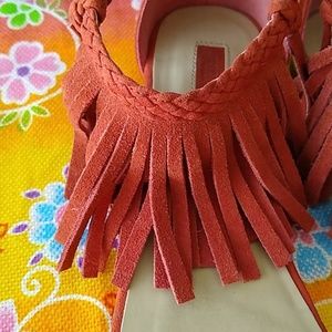 These were so cute I couldn't pass them up. Sandals have fringe in a soft orangey color. With gold around the heel and a strap across the toes. There is a sweat line on the footbed under the toe strap but won't be seen when wearing. The ankle strap and the toe strap are braided. Not alot of wear as you can see from the pics.