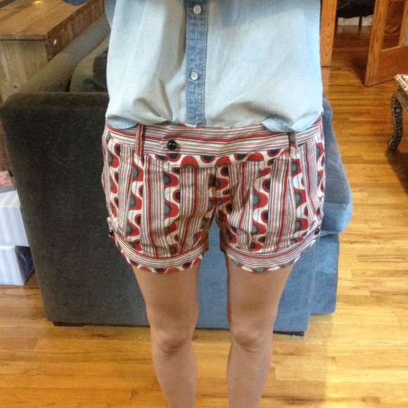 Super cute printed shorts with great button details. Waist has been altered to fit a smaller size but can be let out. Current dimensions after alterations are 33 1/2" waist, 40" hip, 5" inseam. Worn once. No trades, no PayPal. 10% off bundles.