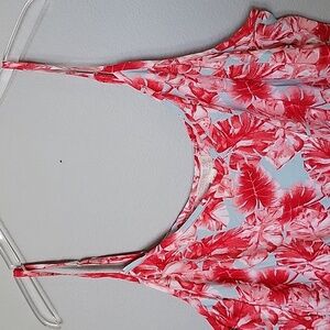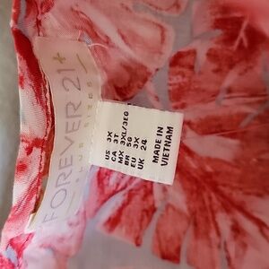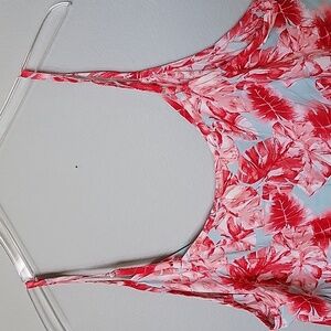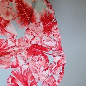 This is tagged as a 3X, however I feel it measures closer to a 2X. Lightweight thin, fabric, doesn't stretch. A very light blue-green back ground with coral/ reddish palm leaves all over. V neck and adjustable spaghetti straps. Elastic at the waist. Summer, beach, poolside, vacation, resort, colorful, bright, statement, fun, casual, luau, botanical, garden, dainty, feminine, bold, festival, Curvy, plus, effortless, easy,