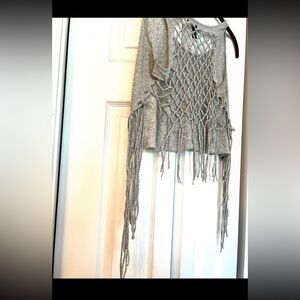 Chic gray tank with intricate graphic and fringe hem. Ideal for casual wear.
