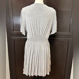 Chic gray mini dress. Deep V-neckline. Short sleeves. Elastic waist for comfort.