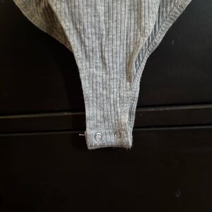 Two different Forever 21 bodysuits. One is light gray ribbed and the other is red with white floral print and also ribbed. Both have snaps, and both are size M
