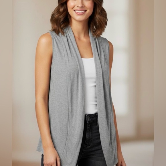 Stylish gray vest. Sleeveless design. Draped open front. Gently used, no stains, no flaws. Perfect for layering.