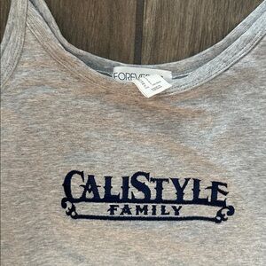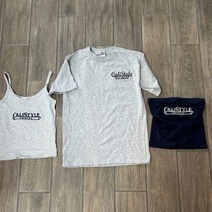 Includes a gray tank top, gray t-shirt, and navy tube top. Size small. Casual and comfy. Custom embroidered “Cali Style Family”, “Cali Style Low Riders”. Gray shirt has navy embroidery, navy tube top has gray embroidery. NWOT