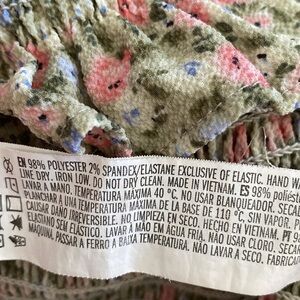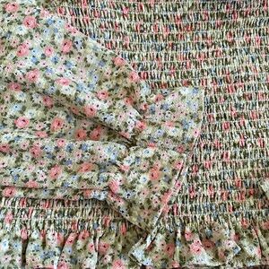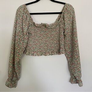 Ditzy floral blouse with smocked bodice and peasant sleeves. This blouse features a square neckline and cropped fit. Ideal for casual wear.