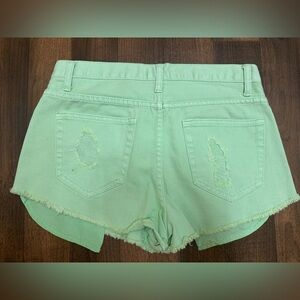 These Forever 21 jean shorts in a vibrant green hue offer a trendy distressed look with frayed edges, perfect for a casual summer vibe. The cut-off design adds a touch of laid-back style, making them a must-have for warm-weather outings.