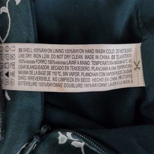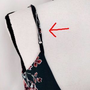 Sleeveless featuring a plunging, v neckline. It has a grommet hole, lace up chest. Thin adjustable spaghetti straps. The back is very low cut. Vibrant floral print throughout. Hidden back zipper close. Made from fairly lightweight fabric. Fully lined.