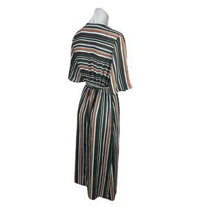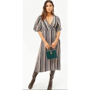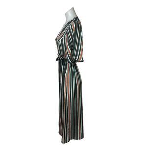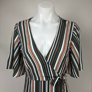 Forever 21 Green Orange Striped Faux Wrap Surplice Short Sleeve Midi Dress Sz S