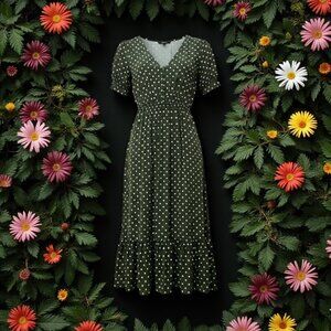 Forever 21 Green & White Polka Dotted Button Down V Neck Maxi Dress