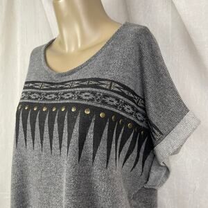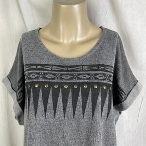 Gray & black knit short-sleeve shirt w/ Southwestern print & brass studded detail on front (large & small studs)