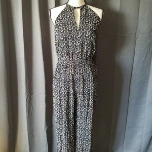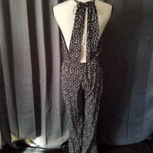 Forever 21 Jumpsuit with Trial Print. Adjustable Halter Ties, Backless Bodice. Keyhole "V" shape neck cut out detail. Black and white color design. Buttons and ties at neck. Zipper closure in back for pant. Slight bell bottom/wide leg style. Strip of elastic gathered waist for fit.